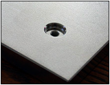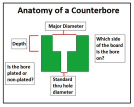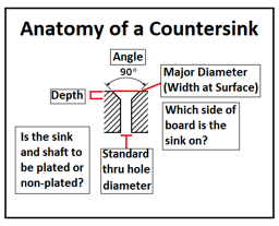 A countersink is a cone shaped hole cut into the laminate. It is typically used to allow the tapered head of a screw to sit flush with the top of the laminate. By comparison, a counterbore makes a flat-bottomed hole and its sides are drilled straight down. This is usually used to fit a hex-headed cap or screw.