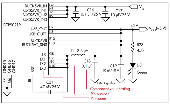 2. Proper schematics, such as this one for the IDTP9021R wireless power receiver’s buck regulator block, include pin numbers, names, component values, ratings, and other vital details.