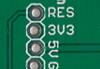 A small trace connecting the Reset___ pad to elsewhere on the board. A larger, thicker trace connects to the 5V power pin.