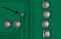 Front and back of the same PCB showing a tented via. This via brings the signal from the front side of the PCB, through the middle of the board, to the back side.