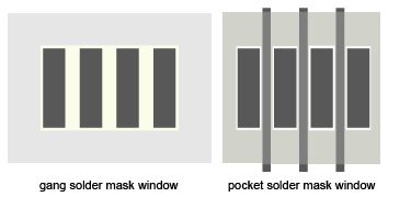 Excessively thick solder mask can cause drawbridging where used between component pads, and omitting mask between chip component pads is sometimes recommended to reduce this effect, and also make cleaning easier. This of course is not possible when tracks are run in the spaces between pads. The two different types of solder mask window needed are shown in Figure 5, from which it is clear that pocket windows need solder mask that is much better defined and in register than gang windows.