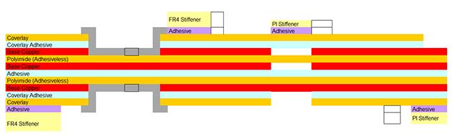 Example of 3-layer flex circuit with fr4 and polyimide stiffeners both sides