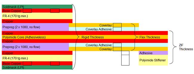 Stiffeners are also commonly utilized in rigid-flex designs, in the flex areas, serving the same purposes as in flex only designs. Designs can incorporate flex sections, or tails, that terminate in ZIF contacts and, as such, require a polyimide stiffener to meet the ZIF connector specifications. Flex areas may also have components which then require FR4 stiffeners for support and reliability.