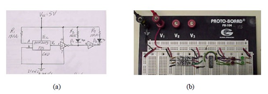 Fig 2: The optosensor circuit: (a) hand-drawn schematic and (b) prototyped circuit.