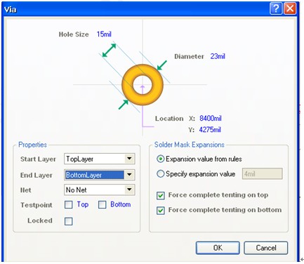 When you use the via make sure the min hole size is>10mil, for a low cost PCB the via diameter>15mil and the pad around the via diameter >23mil, which will give a min ring of 8mil. One example is shown in Fig 4. If space is not a problem always try to have a min 15mil hole and 10mil ring.