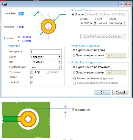 When you design the PCB, in the PCB files if the clearance between pads is 4mil that really do not mean that you will have a solder mask dam in the boards you received. Most of the PCB design software has a feature to control the solder mask, called “solder mask expansion”. Due to the limitation of the equipment, the pads on the solder mask layers larger than the pads on the copper, it is impossible have a solder mask opening the same size as the copper pads due to the limitations of the equipment. If we have the mask opening the same size as the copper layer then the solder mask will cover the pads if the mask layer shifts a little during the manufacture process. Most of the PCB house will need solder mask expend 0.1mm=4mil larger than the copper pads, which is shown in Fig 13, in the expansion area there will be no solder mask. For example if on the copper layer the clearance between pads is 12mil, solder mask expansion is 4mil, which means that the clearance on the solder mask layer is 4mil (12mil-4mil*2, 4mil added on two pads), there will be no solder mask between the pads if we use black solder mask, and green solder mask will be hit the most of the manufacture's limit. With Gold Phoenix with green solder mask we need at least 4.5mil clearance between pads, and 6mil clearance for black solder mask in order to print solder mask between pads.