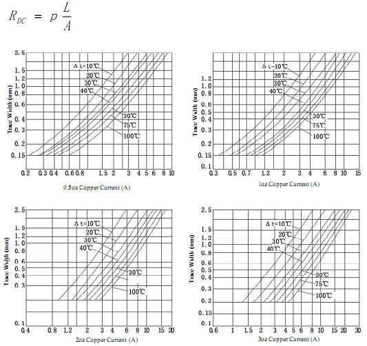 This calculator is accurate up to 35A current, up to 400mils of trace width, from 10C to 100C temperature rise, and copper of 0.5oz/ft to 3oz/ft. Outside of this ranges, calculator won't produce accurate results. The DC resistance of the trace can be calculated as below: for copper at 25 degree p=1.724X10-8ohm/meter, at 100 degree p=2.3X10-8ohm/meter. AC resistance is more complex due to skin effect.